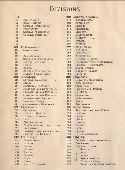 Il sistema si componeva – e ancora oggi si compone – di dieci matrici principali (classes), progressivamente numerate da 0 a 9, da scomporre in altrettante sotto-sezioni decimali (sub-classes), e così via, attraverso le successive e ulteriori subordinate, con possibilità di estensione pressoché illimitata. Mutuando parzialmente l’ordine già proposto da Harris, dopo una prima classe di carattere generico (000/General), Dewey riservò la matrice iniziale alla Filosofia (100), mentre all’opposto quella finale (900) era occupata dalle Scienze Storiche; nel mezzo tra questi due poli, l’intero “restante” sapere umano.