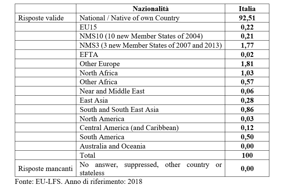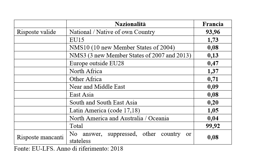 Il problema dell’invisibilità si coglie anche studiando i dati censuari o le rilevazioni campionarie effettuate dagli istituti nazionali di statistica o da Eurostat. Ad esempio, le rilevazioni sulle forze di lavoro, armonizzate da Eurostat e inserite nella Labour Force Survey (EU-LFS), uno dei dataset europei più importanti, non includono informazioni dettagliate sull’etnia. Osservando i dati sulla Francia, un Paese dove è lecito aspettarsi una diversità etnica abbastanza forte, si nota che circa il 94% del campione è etichettato come “National / Native of own Country”.