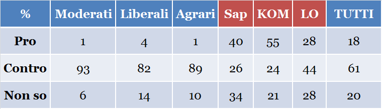 In effetti, molto poco. Tra gli elettori dei partiti “borghesi”, la quasi totalità era contraria, seppure persino da tali partiti fossero venute delle proposte in questo senso. Anche nella stessa SAP, nonché in LO, i favorevoli rappresentavano una minoranza. Solo tra gli elettori comunisti troviamo una maggioranza, ma si tratta di una piccola forza. Insomma: decisamente la cosa non era al centro delle aspirazioni dei lavoratori.